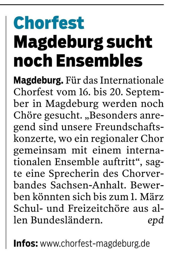 Auch 2026 veranstaltet der Ostsächsische Chorverband e. V. wieder Chorprojekte, an denen Sie teilnehmen und für die Sie sich ab jetzt und bis zum 15.01.2026 anmelden können. Wir werden Ihnen bis zum 31.01.2026 eine verbindliche Zusage ...